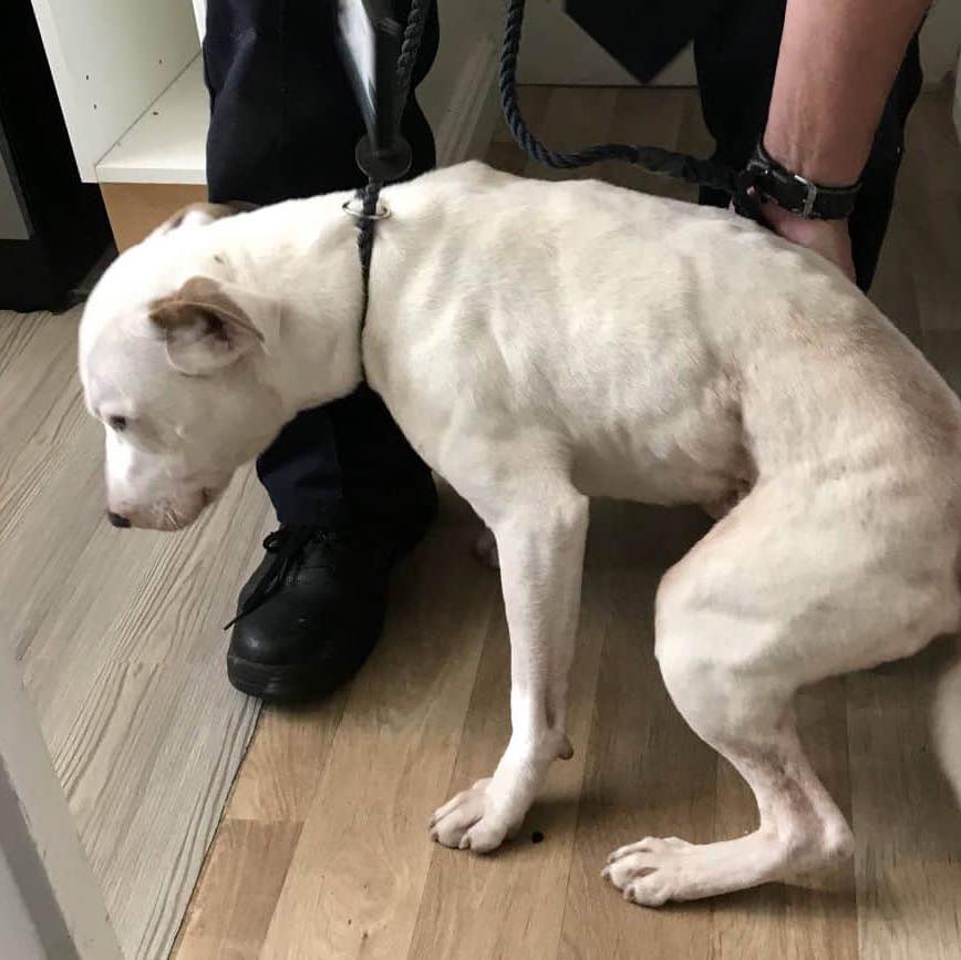 When police helped gain entry, they found Snoop in a severely emaciated condition — his ribs and spine visible, infested with fleas, and surrounded by piles of faeces. The smell of urine was overwhelming, and his food bowl was empty.